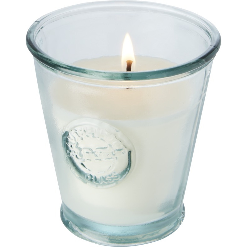 Bougie naturelle, non parfumée, fabriquée à partir de graines de soja, une source durable et renouvelable. Le porte-bougie est fabriqué en verre recyclé à 100 % à partir d'une bouteille en verre. La fabrication en verre recyclé implique moins d’énergie, de matières.