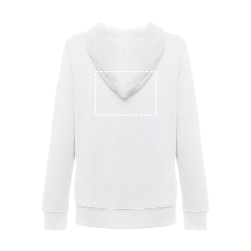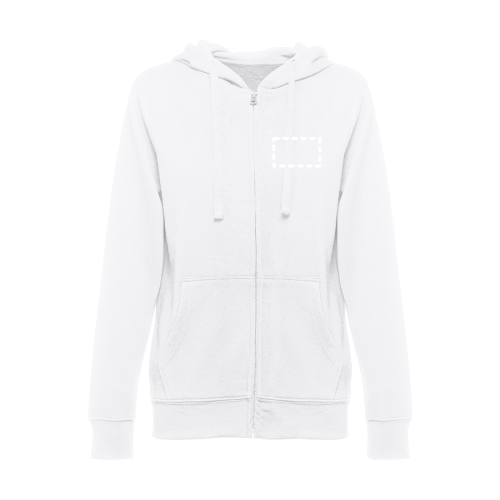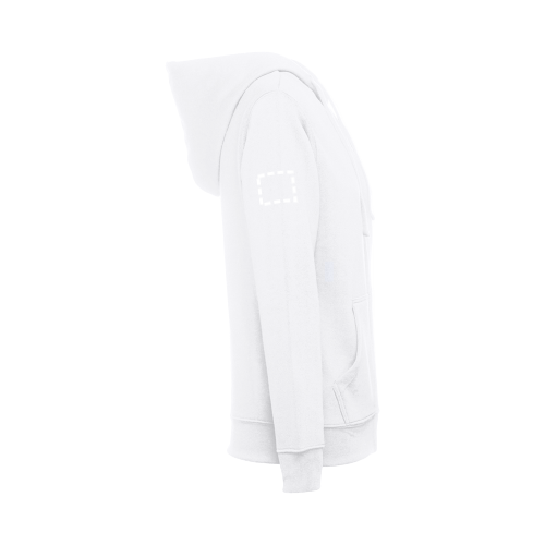 Sweatshirt (unisexe), avec capuche. 50% coton et 50% polyester (320 g/m²). Avec col montant et capuche en taffetas au niveau du col (avec fermeture plastique). Rib 1x1 au niveau des poignets et ceinture. 2 poches latérales avec fermeture zippée colorée