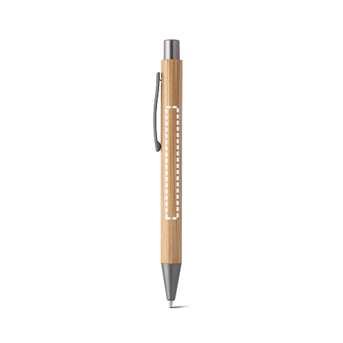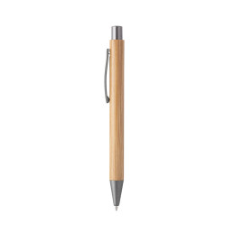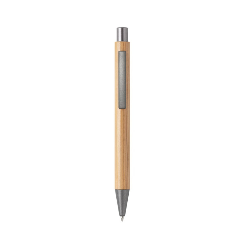 Stylo à bille en aluminium recyclé (100 % RAL) avec finition en caoutchouc. Son design minimaliste associe des détails gris métallisé mat et un bouton en bambou à l'extrémité. Il est doté d'un clip et d'une écriture bleue. Une fois gravé au laser, la couleur de personnalisation deviendra argentée