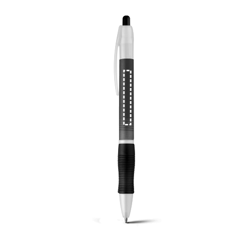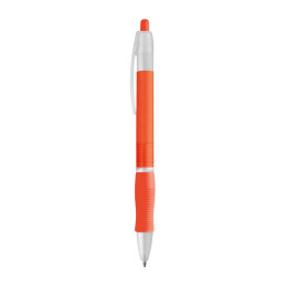 Stylo avec clip plastique et grip en gomme antidérapant disponibles en plusieurs coloris. Ecriture bleue