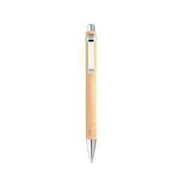 Stylo à bille en bambou avec détails en aluminium chromé. Il est doté d'un clip, d'une pointe tactile à l'extrémité et d'une écriture bleue