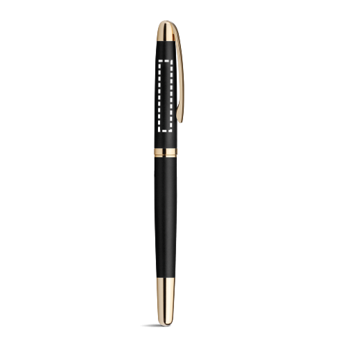 Roller en métal élégant avec capuchon. Détails en imitation cuir. Fourni dans un écrin matelassé. Encre noire