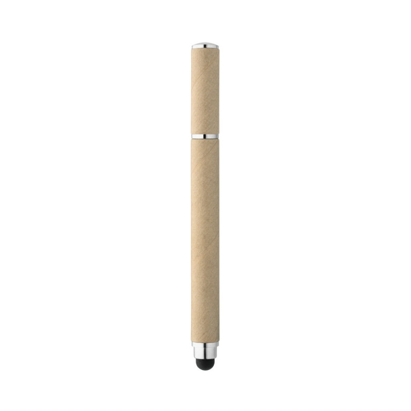 Stylo à bille en bambou avec détails en aluminium chromé. Il est doté d'un clip, d'une pointe tactile à l'extrémité et d'une écriture bleue