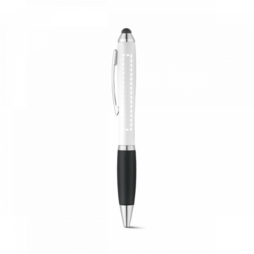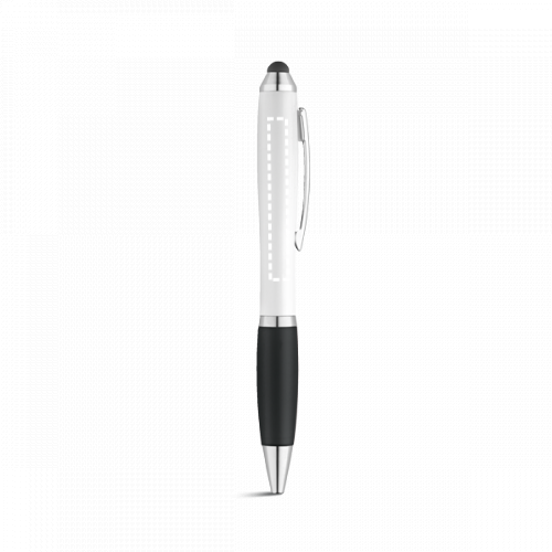 Stylo à bille blanc avec clip en métal et grip coloré. Disponible dans une large gamme de couleurs. Ecriture bleue