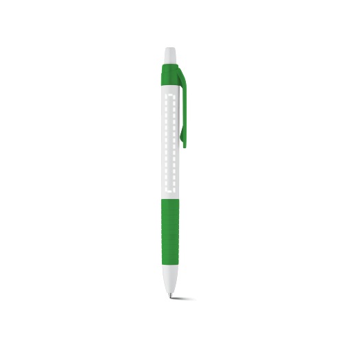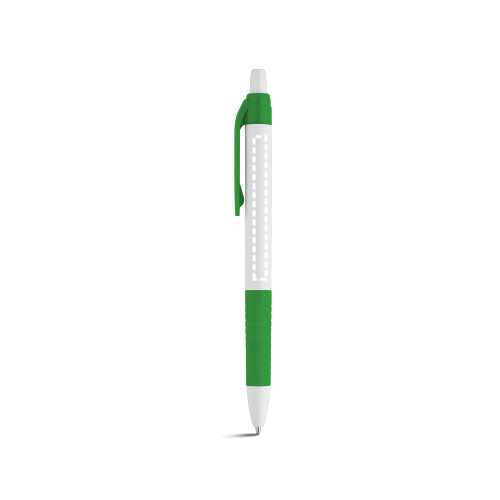 Stylo en plastique avec corps blanc et capuchon de couleurs au choix. Ecriture bleue