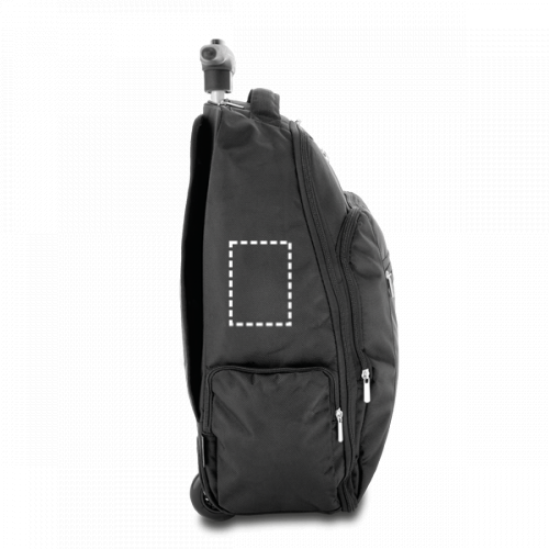 Sac à dos trolley pour ordinateur en 1680D et 300D. Compartiment principal doublé et rembourré, avec séparateur rembourré pour ordinateur de 17''. 2 poches frontales et 2 poches latérales zippées. Avec protection de roues. Anses rembourrées. Poignée extensible en métal avec ressort. Plaque métallique aimantée amovible pour personnalisation. Poids: 1.80 kg. Plaque gravure laser livrée en dehors du trolley. 330 x 490 x 220 mm | Plaque métallique: 50 x 20 mm