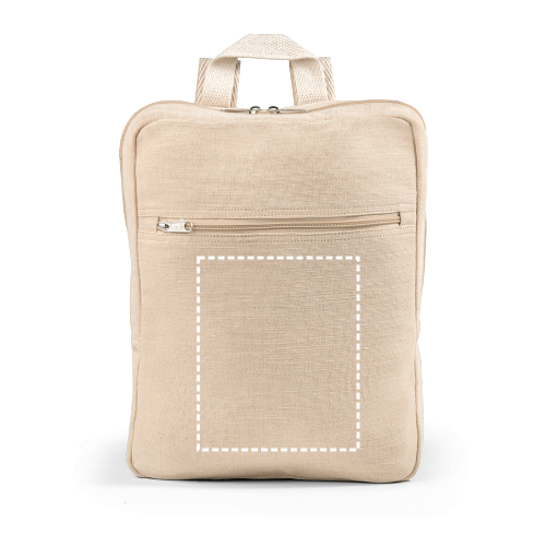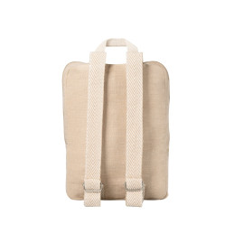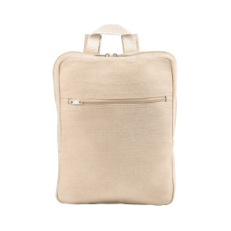 Sac à dos en juco (275 g/m²) avec un compartiment principal et une poche frontale zippée. Poignée en webbing de coton sur le dessus et anses réglables en coton bicolore. Capacité jusqu'à 7 L. 270 x 350 x 70 mm
