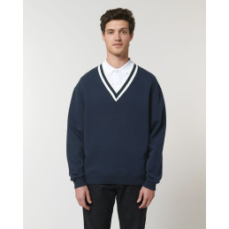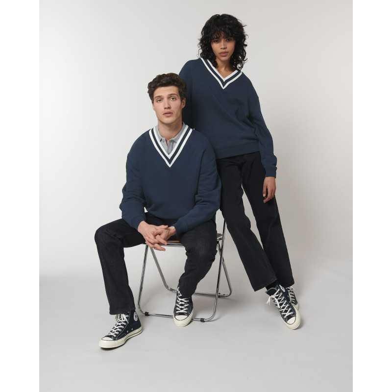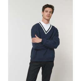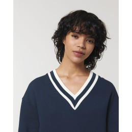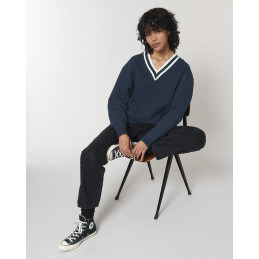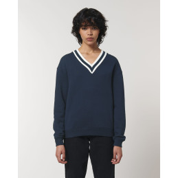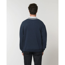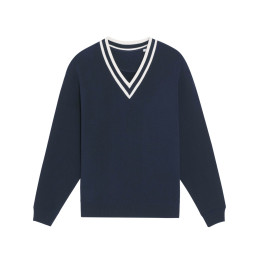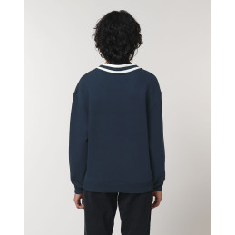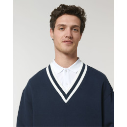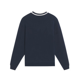 Manches montées Col en côtes lisses 2x2 avec embout bicolore Bas de manches et bas de corps en côtes lisses 2x2 ton sur ton Bande de propreté à l'intérieur du col avec motif à chevrons Demi-lune à l'intérieur du col dans la matière principale Surpiqûre simple au col et au bas de manche Surpiqûre double au bas de corps