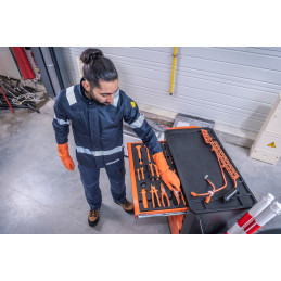 Devant fermé par fermeture à glissière avec patte intérieure et patte extérieure maintenue par pressions cachées