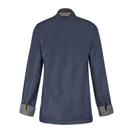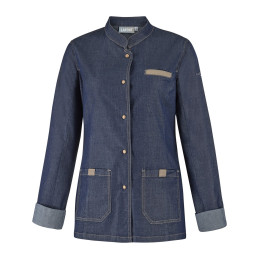 Veste femme en jean. Fermeture milieu devant avec 5 grippers avec calotte effet bois. Deux poches basses plaquées avec un angle biseauté. Poche poitrine à passepoil avec tresse beige en application. Col officier. Effet de contraste au poignet grâce à l’envers du jean. Broderie directe “LAFONT bleu/blanc/rouge” sur haut de manche gauche.