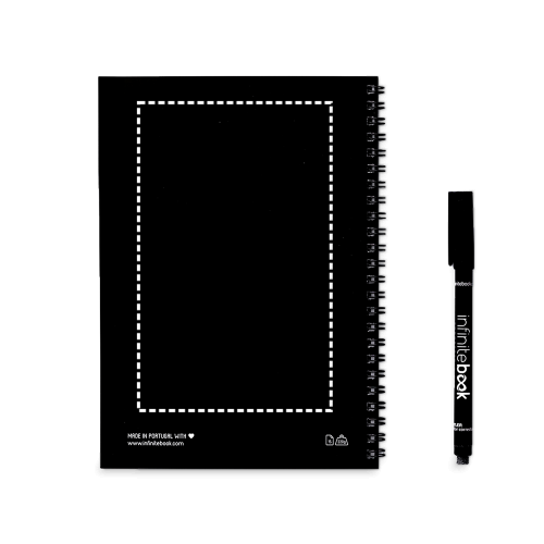 Cahier A5 - "Infinitebook" - avec couverture souple et anneaux assortis à la couleur de la couverture. Contient 15 pages unies de type tableau blanc et un marqueur noir. Ce bloc-notes, qui permet d'écrire et d'effacer facilement, est une solution pratique pour réduire la consommation de papier. Fabriqué en Europe. Livré dans une enveloppe en papier kraft avec autocollant