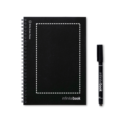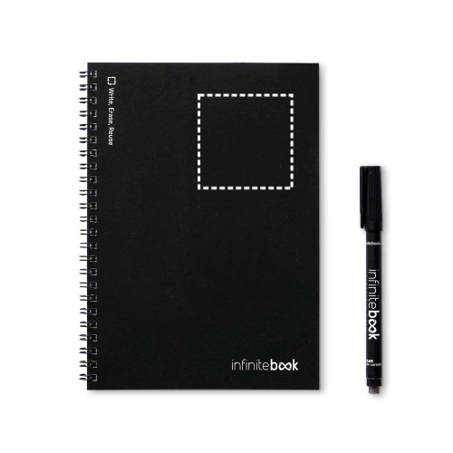 Bloc-notes A5 « Infinitebook » avec couverture souple et anneaux. Contient 30 pages et un marque-page noir. Personnalisation possible en 1 couleur sur la couverture, la quatrième de couverture et les pages correspondantes, le logo Infinitebook restant toujours sur la couverture. Quantité minimale de commande : 50 pièces. Fabriqué en Europe. Pour d'autres...