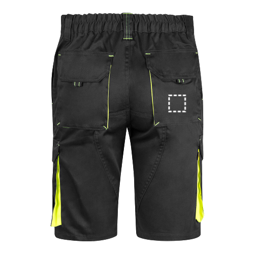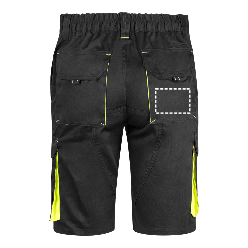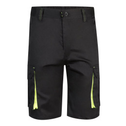Bermuda multi-poches bicolore (210g/m²), en coton (20%) et polyester (80%). Avec ceinture élastique, soufflets, rabats, tirettes et bas de couleur contrastée. Bandes réfléchissantes. Contient six poches (2 poches françaises, 2 poches latérales à soufflet et 2 poches arrière)