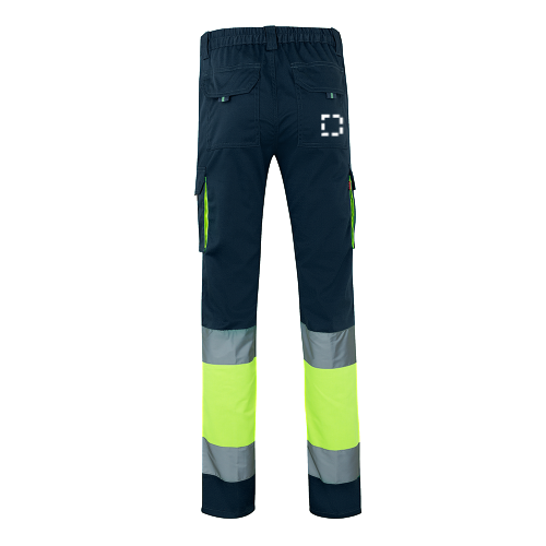 Pantalon en sergé bicolore (190g/m²), en coton (20%) et polyester (80%). Taille élastique, avec bandes réfléchissantes sur le bas du pantalon et cinq poches (2 poches françaises, 2 poches latérales à soufflet et 1 poche arrière)