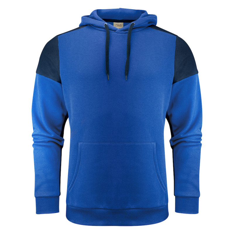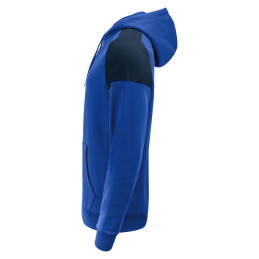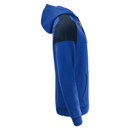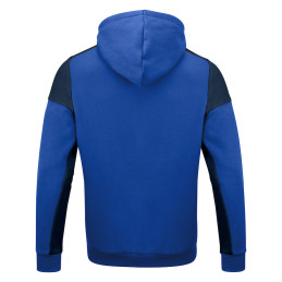 Sweatshirt bicolor à capuche. Poches kangourou à l'avant. Bord-côtes 2x2 aux manches et à la taille. Certifié Oeko-Tex. Polybag compostable.