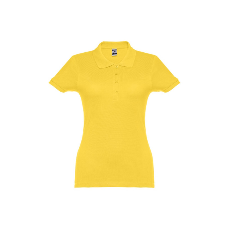 Polo ceinturé pour femme à manches courtes en maille piquée 100% coton (195 g/m²) cardé (couleur 183 :85% coton/15% viscose). Contient un col et des manches côtelés, le col est renforcé avec du ruban piqué. Sur le devant, à côté du col, il y a quatre boutons colorés (bouton de remplacement inséré dans la couture intérieure). Pièce coupée et cousue. Tailles: S, M, L, XL, XXL