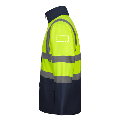 Parka bicolore (190g/m²), en polyester (100%), avec finition PU. Ouverture à l'intérieur du dos, avec zip, pour faciliter la personnalisation. Fermeture à glissière centrale, cachée par une patte de boutonnage, qui se ferme par une bande auto-agrippante. Bandes réfléchissantes sur le torse et les manches. Capuche cachée dans le col et poignets côtelés....
