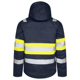 Veste doublée coupe-vent et imperméable avec coutures étanches, matériau rip-stop. Fermeture à glissière à double sens sur le devant avec rabat pour empêcher les courants d'air ainsi que les fuites d'eau, fermeture à bouton-pression. Poches poitrine des deux côtés avec fermeture à glissière, celle de gauche avec support interne pour carte d'identité. Poches latérales avec fermeture éclair. Poches intérieures des deux côtés avec fermeture éclair, sur le côté gauche une poche ouverte avec fermeture velcro. Capuche amovible, réglable de deux façons avec cordon de serrage. Poignets réglables par velcro, avec poignée interne pour le pouce. Ourlet de la veste réglable par cordon de serrage. La doublure peut être ouverte pour faciliter l'impression.