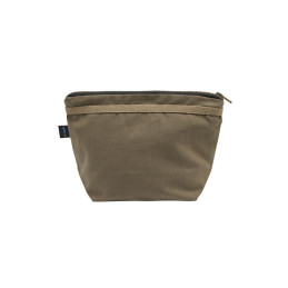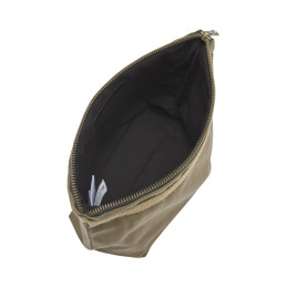 Petite trousse de toilette comprenant un grand compartiment et deux poches intérieures. Fermeture éclair de couleur bronze en métal avec une finition antique. Doublure noire pour les deux couleurs.