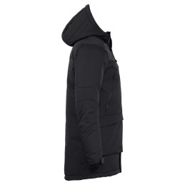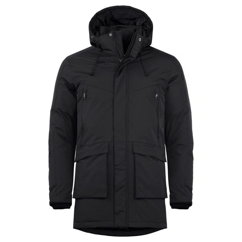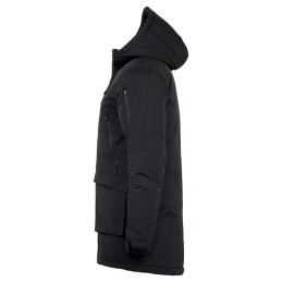 Parka d'expédition unisexe à rembourrage épais. Capuche amovible et réglable. Manches préformées pour faciliter les mouvements. Quatre poches extérieures avec fermetures éclair étanches et deux poches extérieures avec aimants. Une poche de sécurité cachée avec un passage pour écouteurs à l'intérieur de la patte de boutonnage. Deux poches intérieures zippées et deux poches intérieures en mesh. Cordon de serrage à la taille et à l'ourlet. Poignets réglables par velcro avec bord-côte intérieur 2x2 dans la manche. Comprend une fermeture éclair dans la doublure qui facilite l'impression ou la broderie.