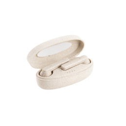 Écouteurs True Wireless en fibre de paille de blé et PP, avec transmission BT 5'0 jusqu'à 10m et autonomie jusqu'à 3h (veille jusqu'à 10h). Chaque écouteur dispose d'un bouton multifonction et d'un microphone intégré, ce qui facilite la réponse aux appels en mode mains libres et d'un voyant lumineux. Le boîtier de charge dispose d'une batterie de 300 mAh et d'un indicateur de charge et d'état de la batterie. Comprend un câble de chargement USB-C. Livré dans une boîte cadeau en papier kraft. 80 x 38 x 32 mm
