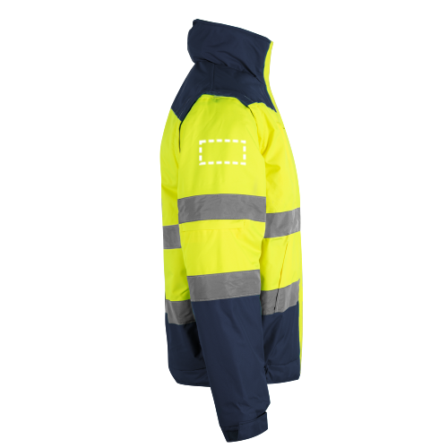 Veste rembourrée bicolore (180g/m²) en polyester (100%), avec finition PU. Fermeture éclair, cachée par une patte de boutonnage, qui se ferme par une bande auto-agrippante. Taille et poignets avec élastique sur les côtés. Bandes réfléchissantes sur le torse et les manches. Capuche dissimulée dans le col et manches amovibles. Contient cinq poches (1 poche poitrine, 2 poches avant, 1 poche sur le bras gauche et 1 poche intérieure). Taille: 4XL, 5XL