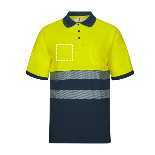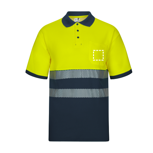 Polo en piqué bicolore (150g/m²) à manches courtes, en coton (55%) et polyester (45%). Boutons, col et bas côtelés de couleur contrastée. Bandes réfléchissantes segmentées sur le torse. Comprend une poche poitrine