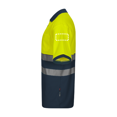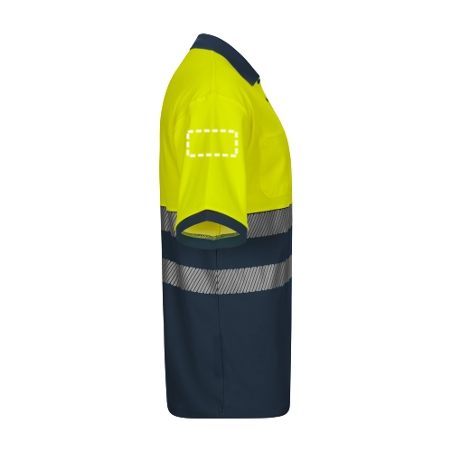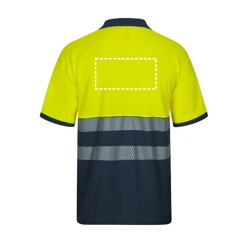 Polo en piqué bicolore (150g/m²) à manches courtes, en coton (55%) et polyester (45%). Boutons, col et bas côtelés de couleur contrastée. Bandes réfléchissantes segmentées sur le torse. Comprend une poche poitrine. Taille: S, M, L, XL, 2XL, 3XL