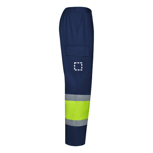 Pantalon bicolore en sergé multi-poches (210g/m²), en coton (20%) et polyester (80%). Avec ceinture élastique et bandes réfléchissantes sur le bas du pantalon. Contient six poches (2 poches françaises, 2 poches latérales à soufflet et 2 poches arrière à soufflet)