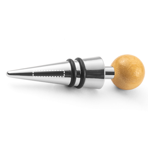 Set à vin en bambou et zinc. Cet ensemble comprend un tire-bouchon avec couteau de sommelier, un collier anti-gouttes, un verseur anti-gouttes avec bouchon et un bouchon